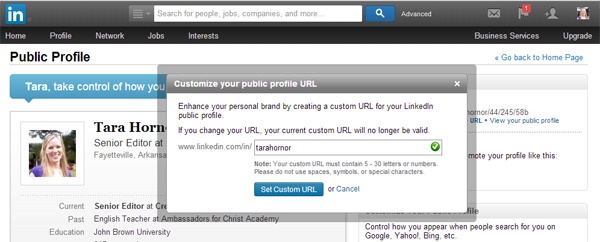 To customize your LinkedIn URL, click on “Edit Profile” either in the drop-down menu under the Profile tab at the top of the page or in your headline box when logged into your profile. Once you are in editing mode, you’ll see your URL in a tiny, almost indistinguishable font at the bottom of your headline box. Click on the “Edit” link next to that URL.
