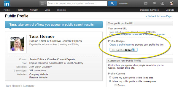 LinkedIn now has this nifty little button you can copy and paste in several different sizes. You can place it on your blog or in your email quite easily. You may have noticed it when you went in to edit your URL. Just underneath the box on the right titled “Your current URL”, you will see “Profile Badges”. Simply click on the “Create a profile badge” link to see the different sizes with HTML you can copy and paste.